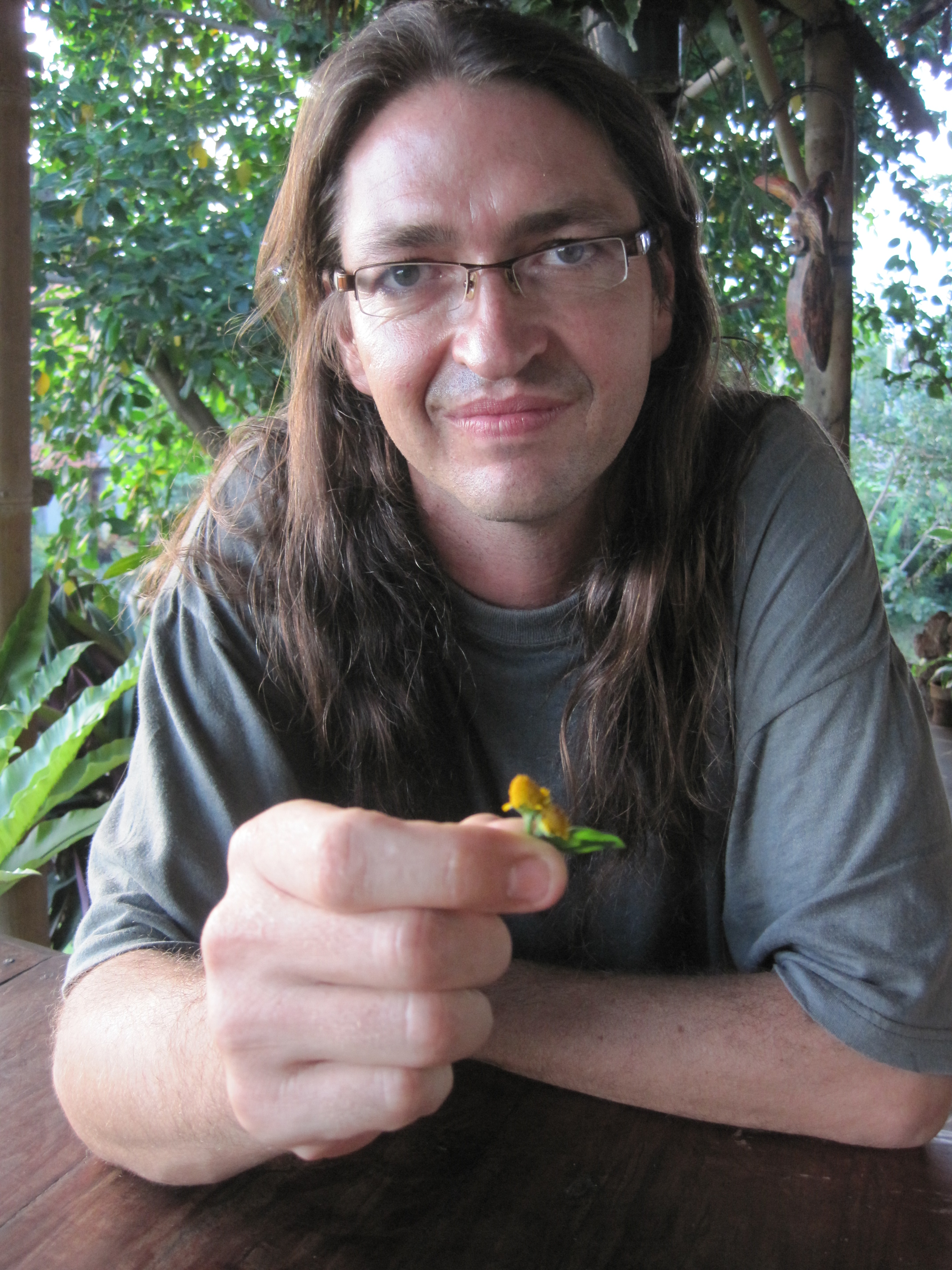 To prove it he leaps off the veranda, bounds through a wild garden beside the house and comes back spinning a posy of yellow blossoms between his fingers. “Spilanthes Acmella,” he announces. “Now this little daisy-looking flower, which can be found all over the world, is just waiting to be part of the revolution.”