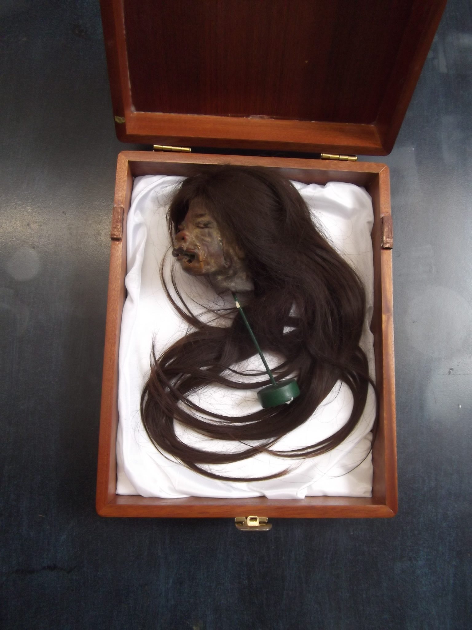 What lay before us was the incredibly well-preserved actual face of a real life person, shrunk to the size of a fist, with rosy cheeks, a flowing mane of luscious black hair and a stick poking out from its neck so it could be stood up for display.